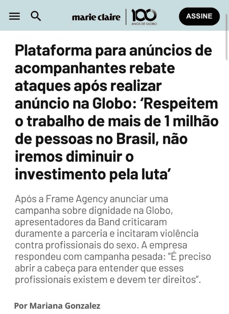 "A Frame é muito importante para mim, me abriu diversas portas. Eu estou tentando quebrar vários tabus em torno disso, porque é uma profissão como qualquer outra"